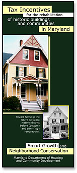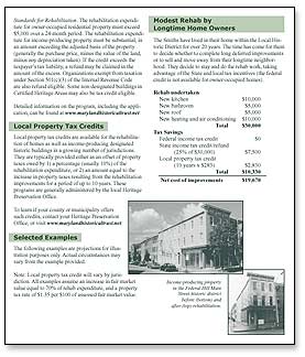 The above is an interior page of a two-color mailer/brochure (with four-color cover) created to inform Marylander's about the Historic Rehabilitation Tax Credits available through the MD Department of Housing and Community Service.