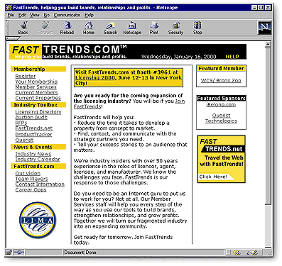 FastTrends.com was the vision of two leading professionals in the licensing industry. They set out to create a company where personally delivered customer services would form the backbone for an industry leading array of easy-to-use, customizable, online tools developed to help members expand their own segment of the licensing industry. Although the vision never became a reality, FastTrends.com servedhowever brieflyas a business-to-business e-commerce partner to a unique licensing community.